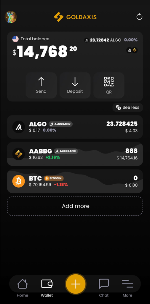 GoldAxis wallet is a multi-platform, multi-currency digital asset wallet created for the new generation. GoldAxis gives you control over your digital assets and a trendy way to interact with them. View your digital asset balances and stay informed with the latest blockchain-related information in the same app.